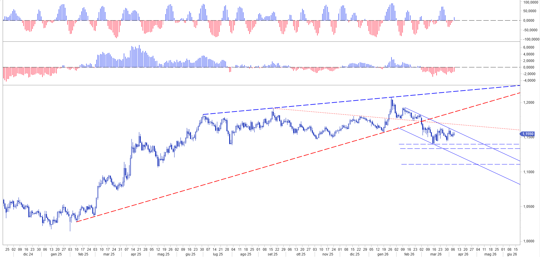 L’impatto immediato di queste tensioni si sta manifestando con forza sui due termometri principali dell’economia globale: il greggio e il mercato dei cambi. Il Brent ha superato la soglia dei 111 dollari al barile, per poi ritornare sotto la soglia di 110, riflettendo il “premio al rischio” per una possibile chiusura prolungata di Hormuz. Uno shock energetico di questa portata agisce come una tassa occulta sulla crescita europea, indebolendo il potere d’acquisto delle imprese. Tuttavia come anticipato sin dall’inizio della crisi da Wlademir Biasia, head strategist del nostro team di analisi, il Brent ha consolidato scambi sotto la soglia dei 120 dollari, costruendo un percorso che potrebbe spingere i valori sotto quota 97, mitigando, qualora violasse tale livello, la pressione inflattiva diretta che comprime la crescita dell’Eurozona.
